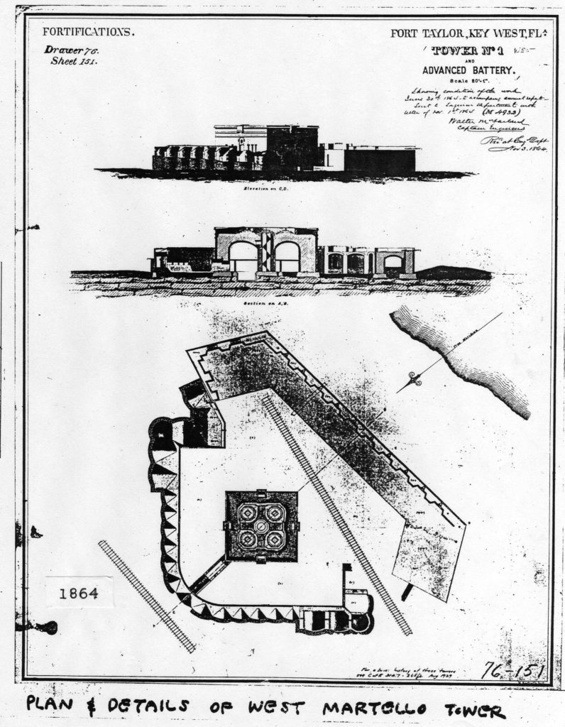 Work on the towers began. Many hazards. West Martello citadel completed. Two Martello Towers linked to Fort Taylor by a railroad. Work went on feverishly for four years, then sporadically for eight years, and then stopped.